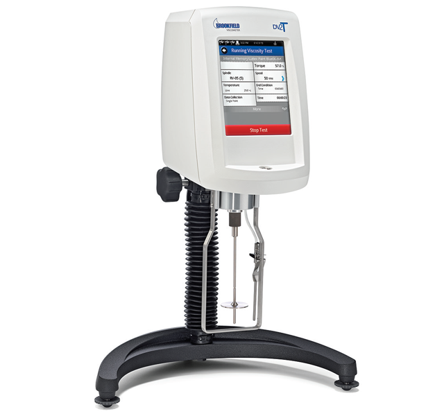 The New DV2T Viscometer features a 5-inch color display to guide users through test creation and data gathering for fast and easy viscosity measurements. The DV2T also offers powerful new programming capabilities and results analysis including data averaging and QC limits with alarms. User instructions with multi-step test protocols can be created using the new Program Generator Software and uploaded to the DV2T through a USB Flash Drive (both included with instrument). Test Data can be recorded directly on a local printer or sent to a PC. Additional automated control and data collection can be achieved with optional RheocalcT software.