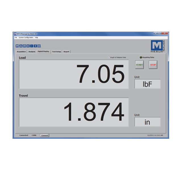 The programs include a set of tools to analyze test results, including statistical calculations, quick data export to Microsoft Excel, customizable reports, pass/fail indicators, and many others. Test setups are customizable and can be saved and recalled. The user can program test start and stop conditions, including load, time, distance, and sample break. Additional features include a large display screen for real time load and travel data and a utility to configure certain Mark-10 gauges from a PC.