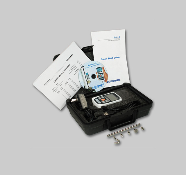 Series 3 digital force gauges are designed for tension and compression force testing in numerous applications from 0.12 lbF to 500 lbF (0.5 N to 2500 N). The gauges feature a sampling rate of 2,000 Hz, producing accurate results under a wide range of test conditions. A backlit graphic LCD displays large characters, and a menu is available to access the gauges’ features and configurable parameters. USB output is provided for data collection purposes.