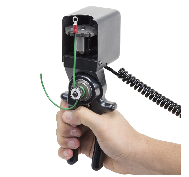 Squeeze the handles together to increase tension on the sample until a break occurs. The peak force is recorded by a Mark-10 indicator. A rotating turret with slots of multiple sizes accommodates a wide range of wire diameters, up to 0.25 in. (6.4 mm).